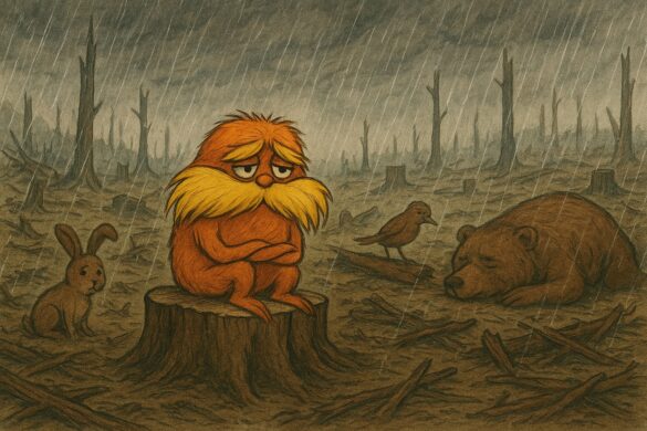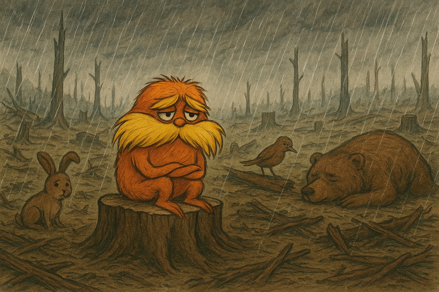 Essa metáfora se conecta com o filme O Lorax: Em Busca da Trúfula Perdida, no qual mostra que a busca desenfreada por aperfeiçoamento leva à destruição total do meio ambiente. O personagem Once-ler acredita que pode crescer indefinidamente, ignorando o custo real de suas escolhas. Cada árvore derrubada parece apenas mais um passo rumo ao sucesso — até que, de repente, esse sucesso se revela vazio.